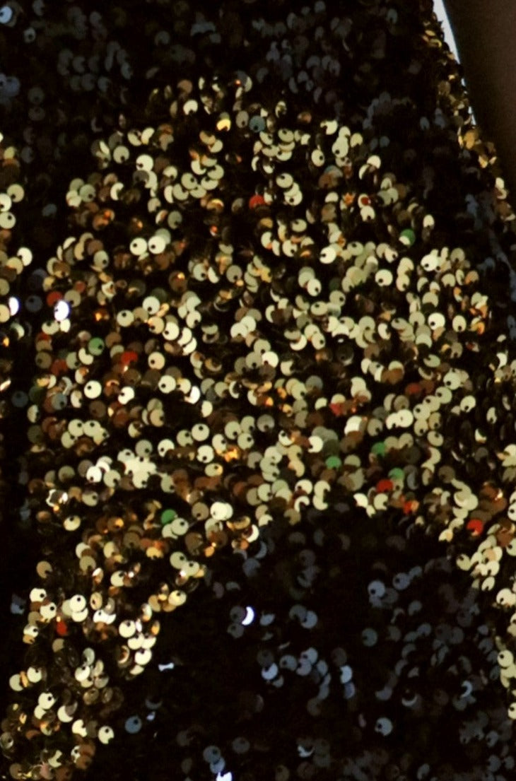 Get glam in our Licorice Sequin Halter Flare Pants Jumpsuit. This piece has an all-over two-tone black & gold sequin swirl motif design. The fabric is stretchy to flatter your curves and has a hidden zipper for easy wearing. Perfect for special events such as a birthday, black tie events, date nights, and much more.