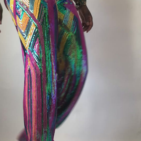 Stand out from the rest in the Zane multicolored geometric sequin harem pants. This pant features a striking, colorful rainbow geometric sequin detailing. The fabric is stretchy and will conform to your body to accentuate your curves. Perfect for a fun night out, birthday dinner, and more.